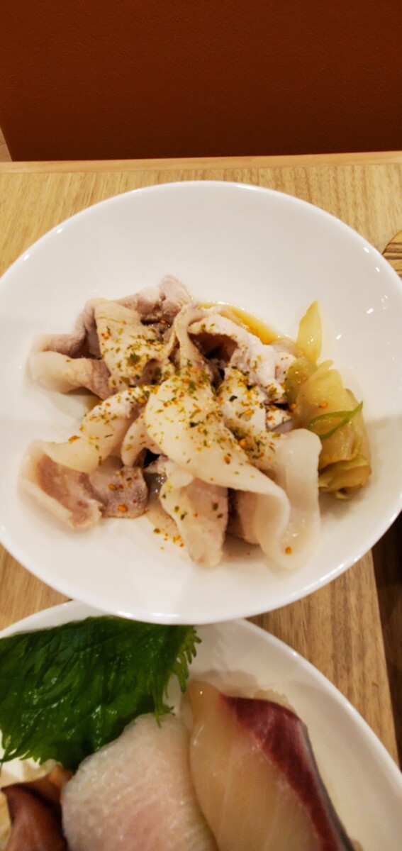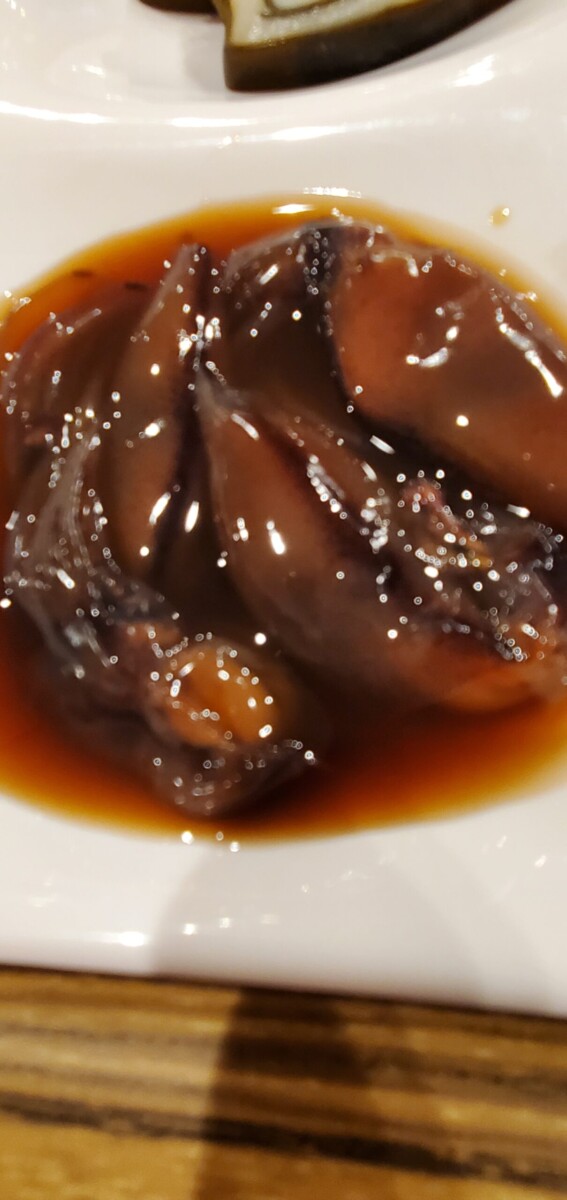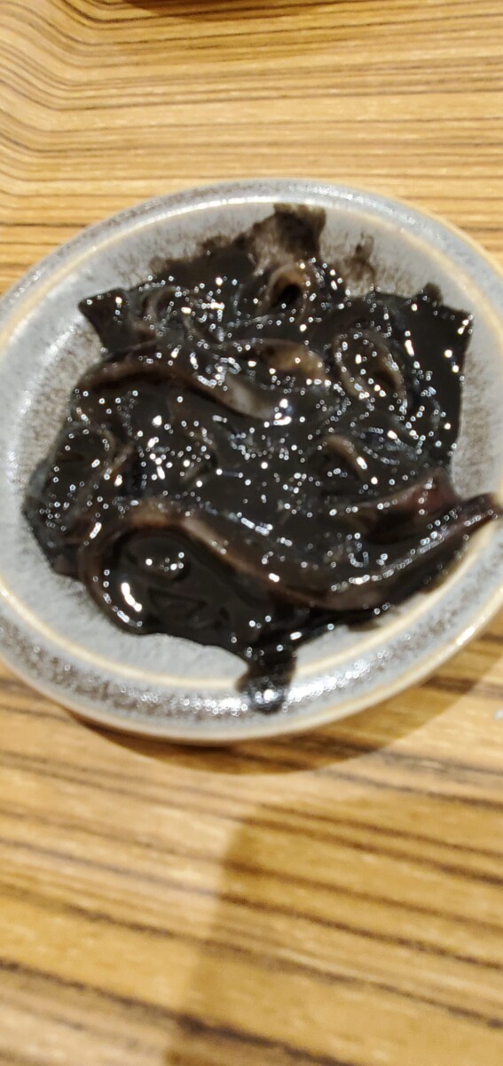 イカ墨の塩辛。これ意外と美味しいですよ。その横にイカの沖漬け。これらは富山の名産です。