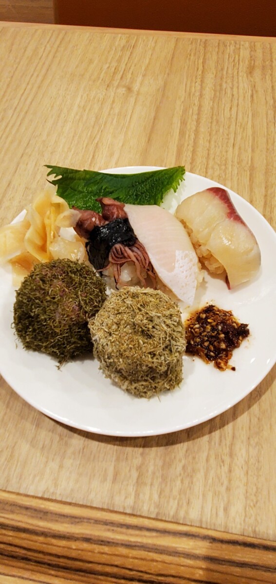 小さいおにぎりに巻かれてます。とろろ昆布巻き。ブリの握りずしも一緒にどうぞ。