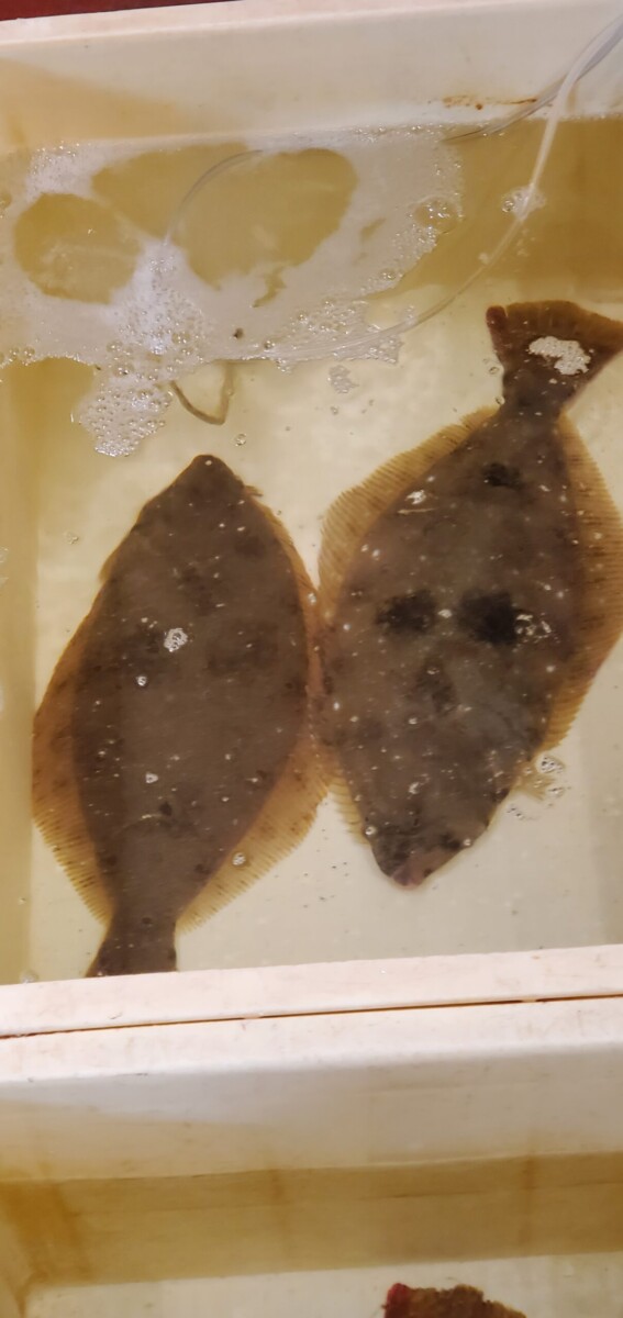 ヒラメが泳いでいます。アサリですアサリ。美味しそうなイカも並んでます。
