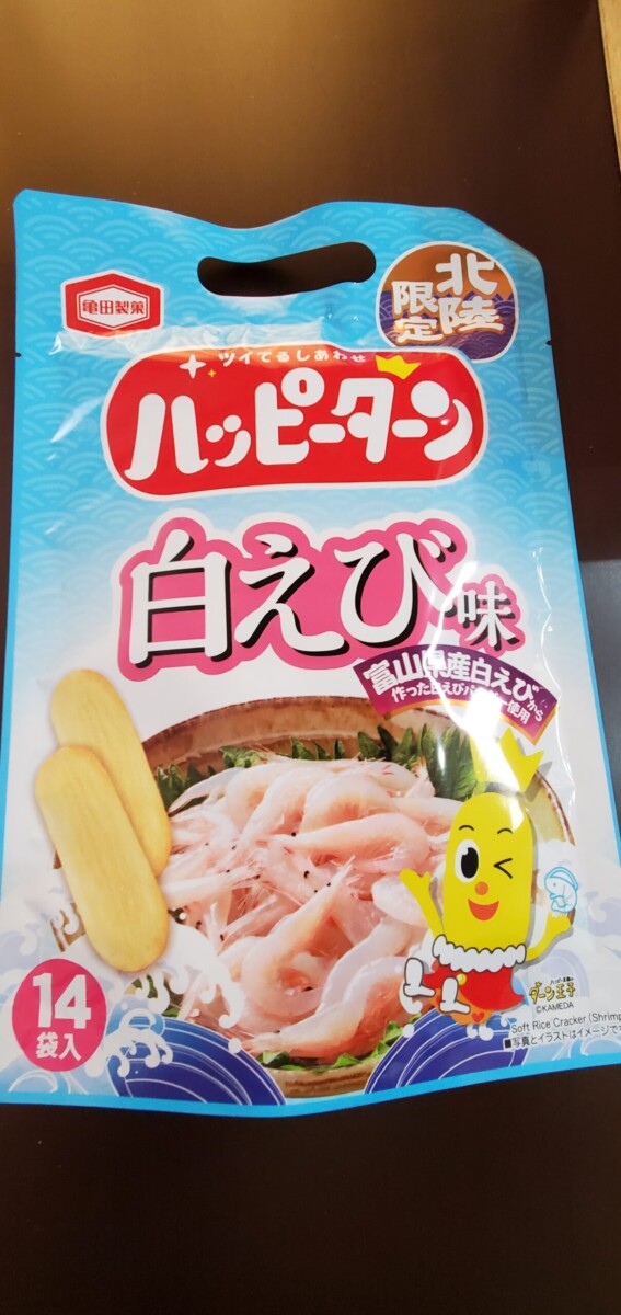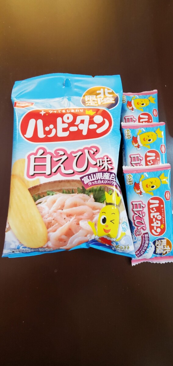 まずはハッピーターン白海老味。そして富山ブラックのポテチ。